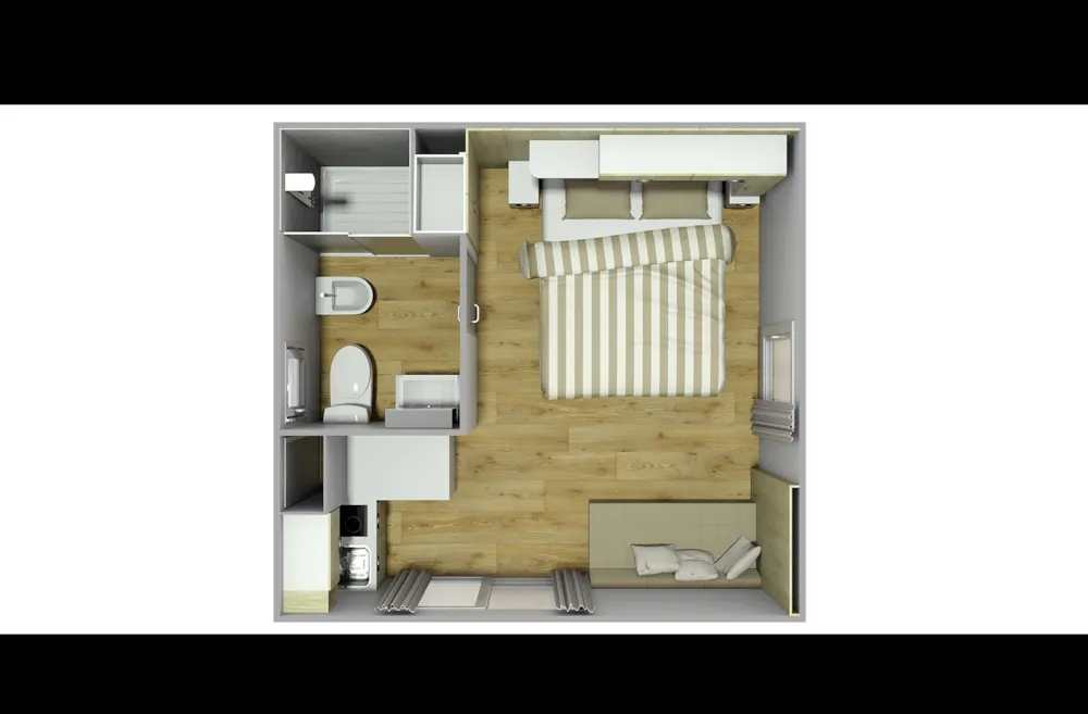 Cet hébergement, d’une superficie de 24m2 + véranda couverte, peut accueillir jusqu’à 4 personnes. Idéal pour les familles, il dispose d’une chambre avec lit double, une chambre avec 2 lits simples, salon avec table, canapé et chaises, cuisine avec réfrigérateur, cuisinière, 1 salle de bain avec WC, douche et lavabo et 1 salle de bain avec WC et lavabo. Grande véranda ombragée extérieure, avec table et chaises de jardin, où vous pourrez vous détendre. Le logement dispose de volets, climatiseur, et d’un sèche-cheveux.