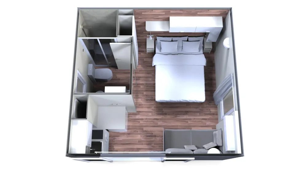 Das Mobilheim ist zweckmäßig aufgeteilt. Separates Elternschlafzimmer und Kinderschlafzimmer. Kleine Wohnküche mit 4-flammigen Gasherd und Spüle, Badezimmer mit Dusche und WC sowie zusätzlich separates WC. Davor eine Veranda mit Tisch und Stühlen.