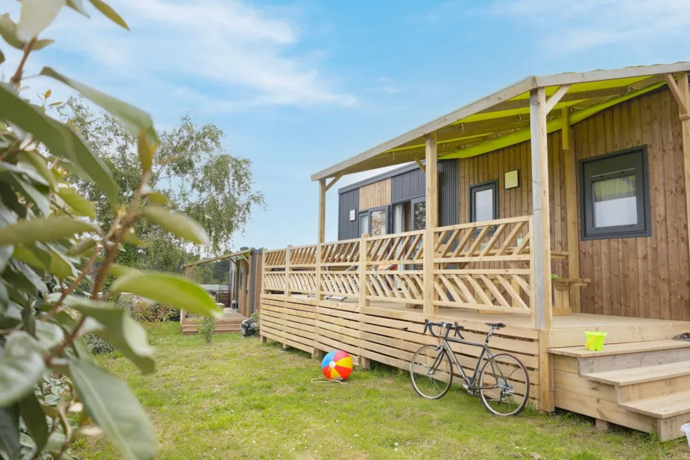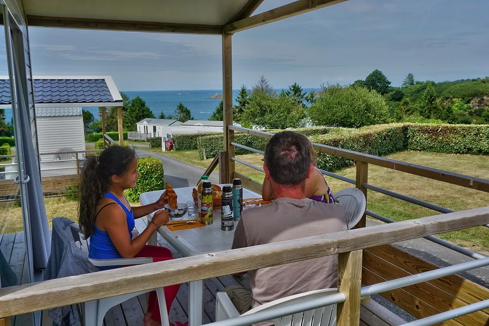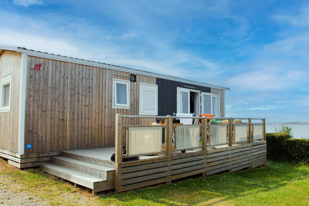 Mobil-home Privilège 2 chambres pour 5 personnes avec vue panoramique sur la mer. Il est équipé d'une terrasse en bois, des draps coton et serviettes de toilette, d'une plancha gaz , de la télévision d'un lave-vaisselle.