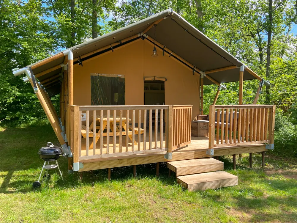 Les cabanes se situent dans la forêt, dans la zone West. Ces hébergements atypiques sont tout confort et bien isolés, avec salle de bain et toilette séparée et une cuisine entièrement équipée. Ces petites maisons en bois de 27m2 sur pilotis avec une terrasse de 13m2, sont de très grande qualité, durables et respectueuses de l’environnement. (superficie 27m2 - terrasse 13m2) 5/7 personnes / 2 chambres. Un espace "lounge" avec tables sous une grande tente, convivial et chaleureux, est installé juste à côté des cabanes pour que les groupes puissent se retrouver ensemble.