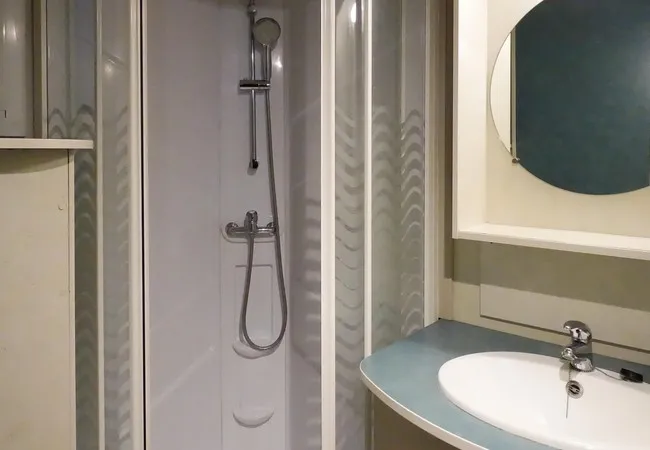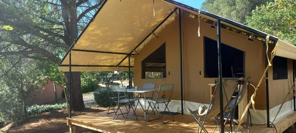 Une toile de tente, d’accord, mais avec un plancher en bois, deux chambres indépendantes (une chambre avec un lit double, et une avec 2 lits simples), une cuisine et une terrasse pour un hébergement confort, tourné vers la nature, et joliment assorti à l’environnement qui l’entoure. Cet hébergement ne dispose pas de sanitaires (sanitaires communs du camping).