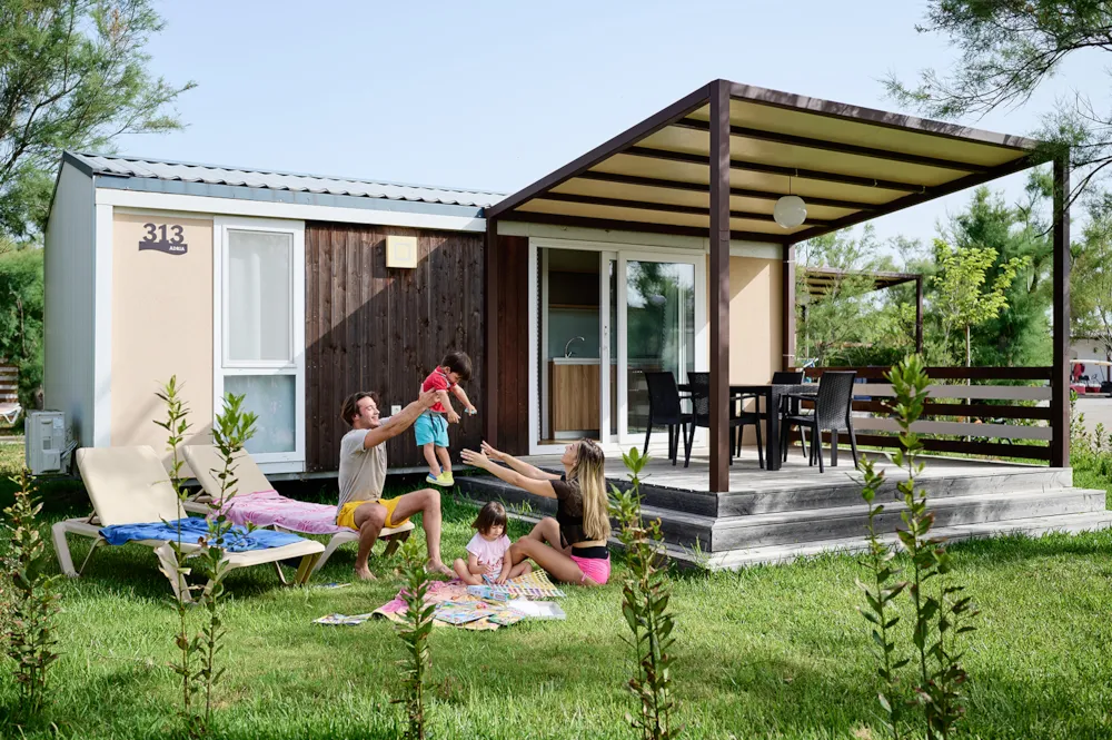 The Safari Glamping Tent is characterized by the sober elegance of the furnishment and the wide spaces. The unit is equipped with air conditioning, TV and electronic safe. The kitchen is fitted with microwave and under-top refrigerator with ice box; the bathroom is equipped with bidet. Each unit has a furnished and covered veranda and a wide garden with two sunbeds. The beach service is included in the stay: it includes one umbrella and two sunbeds from the second row. The entrance to the swimming pool area is included.