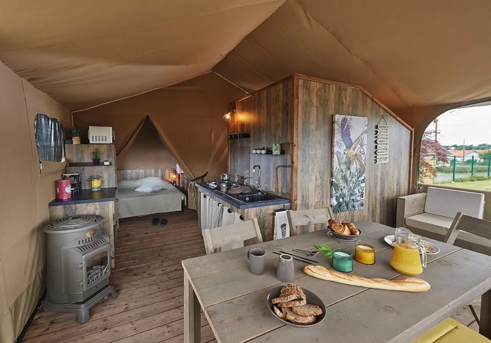 La tente est très spacieuse, l'équipement est complet (comme à la maison). Nous avons adoré passer notre séjour dedans, les enfants aussi, les lits sont confortables (même le canapé lit). Nous recommandons cette tente !