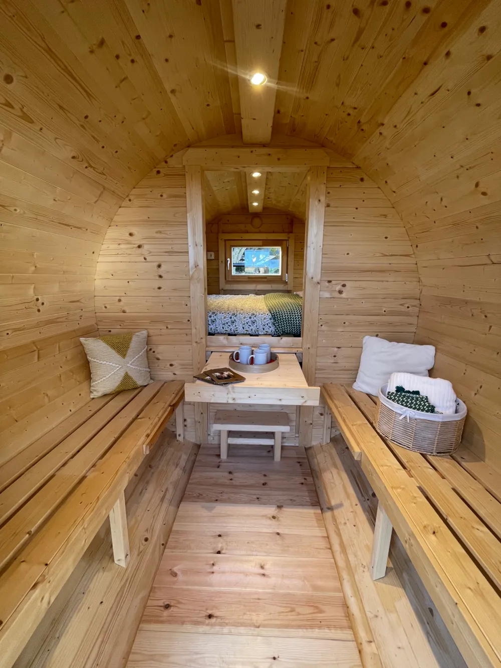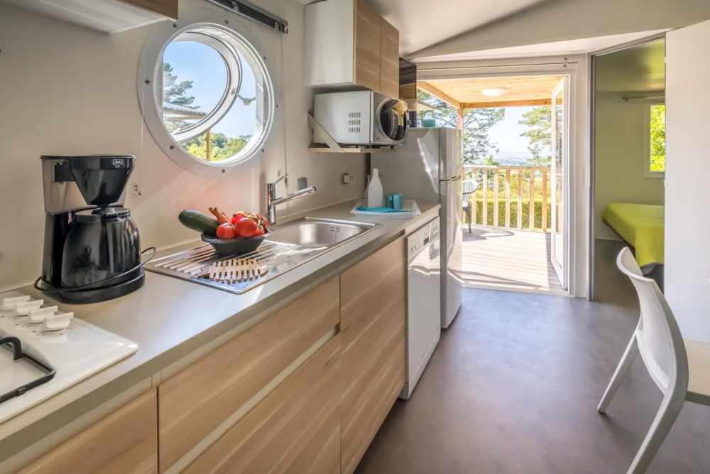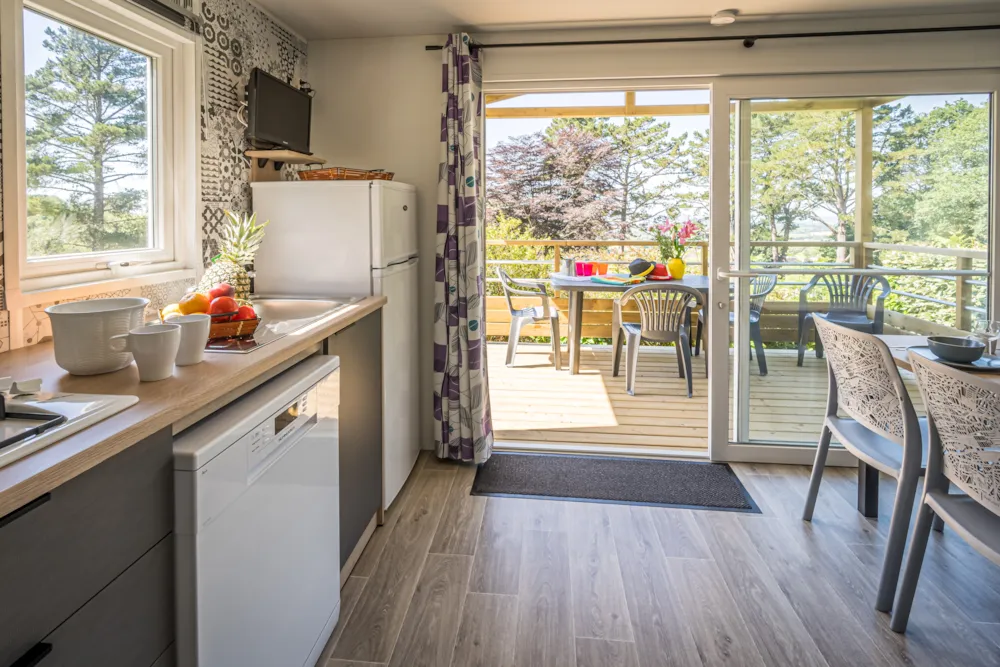 2 chambres une avec un lit de 140*190 cm et l'autre 2 lits d'une personne, salle de bain avec cabine de douche et lavabo, WC séparés, cuisine équipée (Produits ménagers respectueux de l’environnement fournis), espace repas/salon avec table chaises et banquette (banquette-lit dans certains mobilhomes), télévision. Terrasse semi-couverte avec salon de jardin.