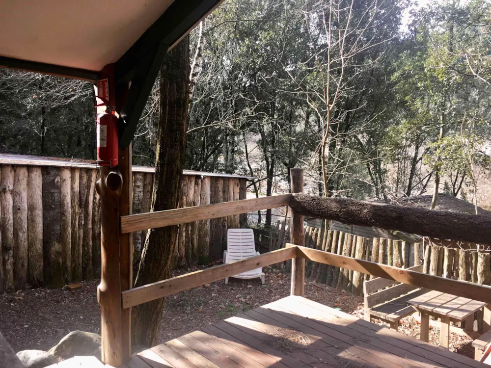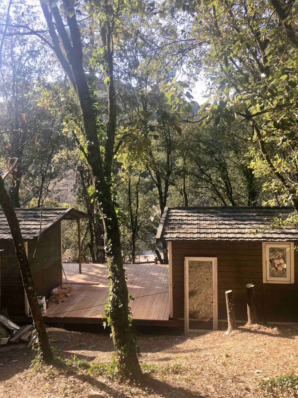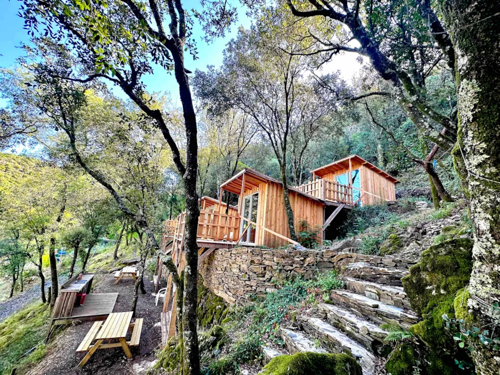De petits chalets au coeur du camping, une table de pique-nique pour profiter du jardin privatif, proche de la plage, du restaurant et du coeur de vie du camping