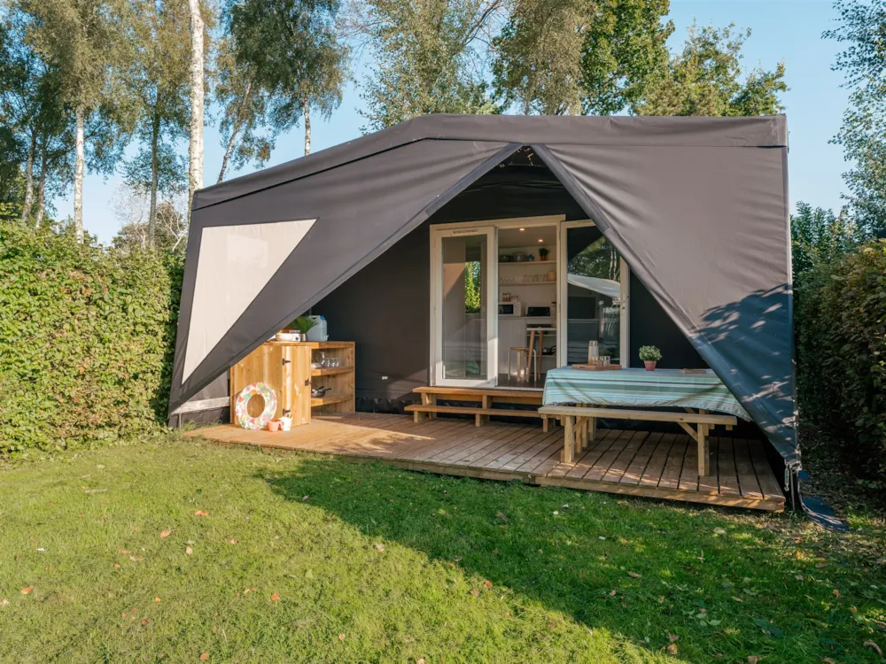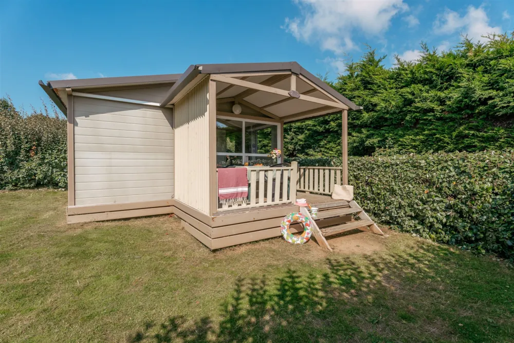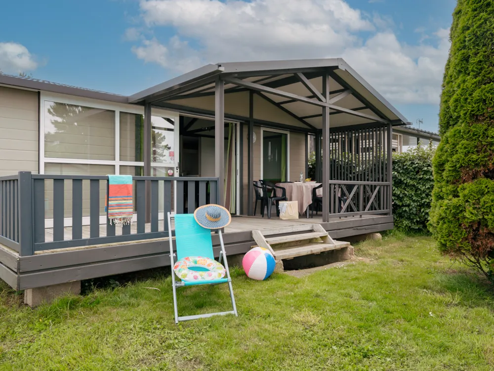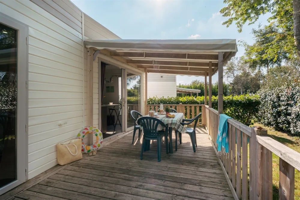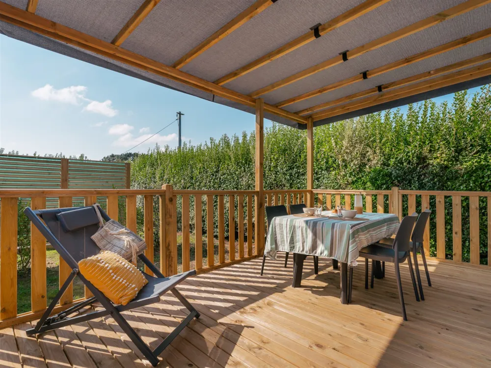 Mobilhome Tribu composé de deux mobilhomes reliés par une grande terrasse couverte avec salon de Jardin.