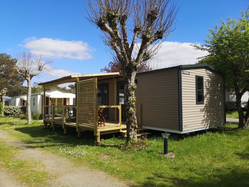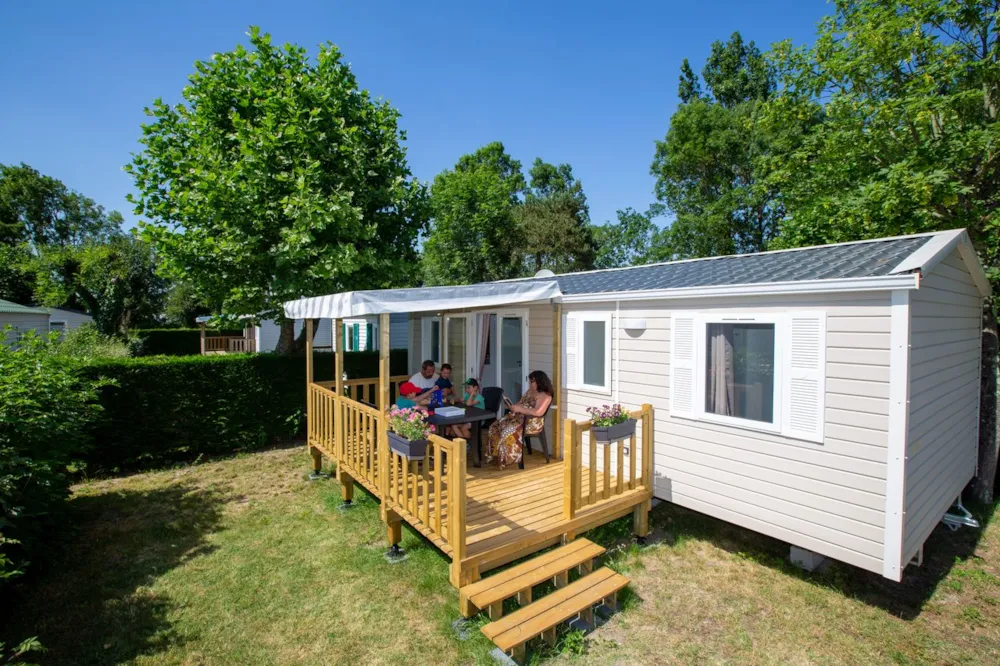 Mobil home agréable, situé à côté des aires de jeux. Terrasse ombragée ++. Propre dans l’ensemble. Store occultant et moustiquaire appréciable dans un mobil home. Kit de bienvenue. Grandes chambres.