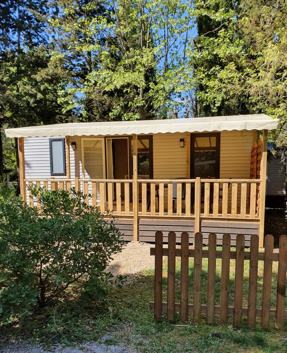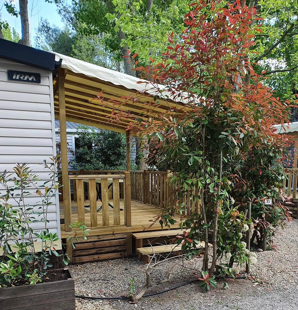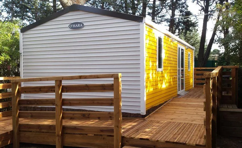 Le Family Plus 3 chambres - 6 pers. max. + bébé - 32 m2 (animaux interdits - 4 adultes maxi) - modèle 2016 : 1 chambre avec lit 2 pers. (140x190), 2 chambres avec 2 lits 1 pers. (80x190), coin repas, réfrigérateur, cuisinière à gaz 4 feux, hotte, salle de bain (lavabo + douche), WC séparé, terrasse extérieure avec salon de jardin. Climatisation en option.
