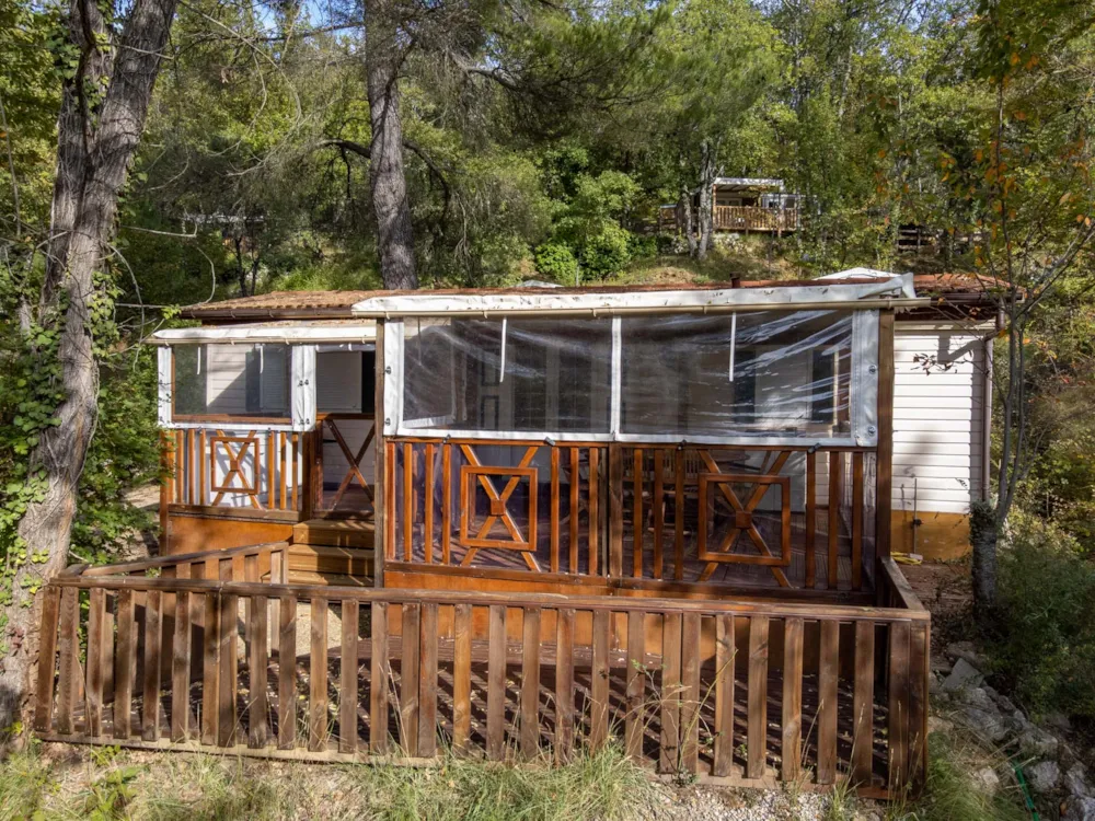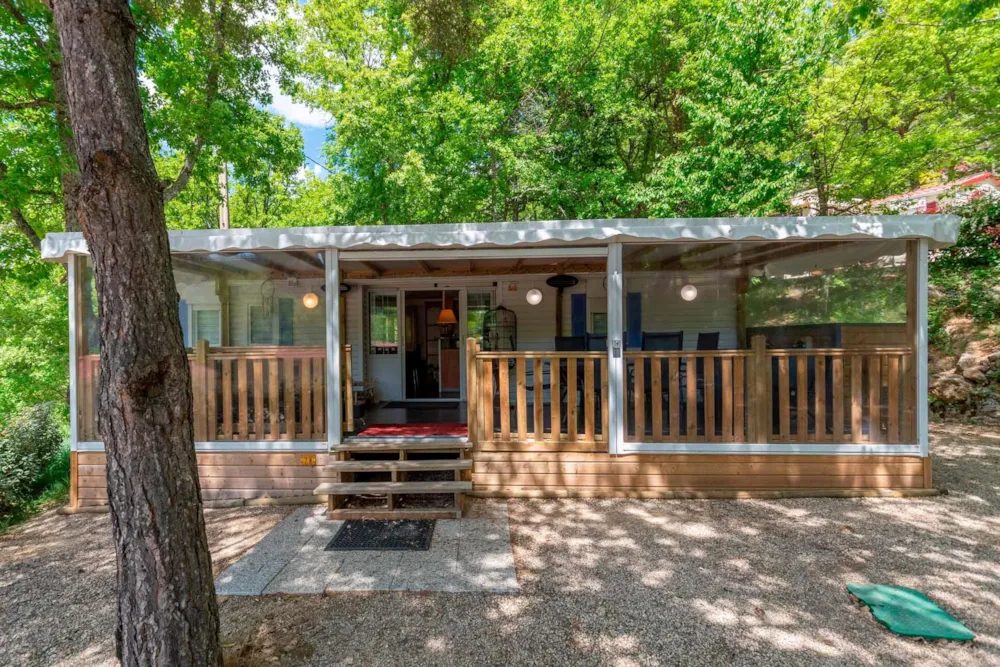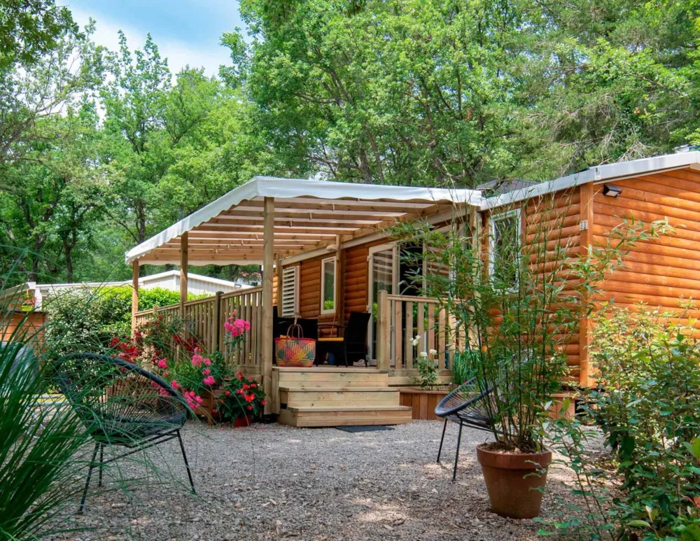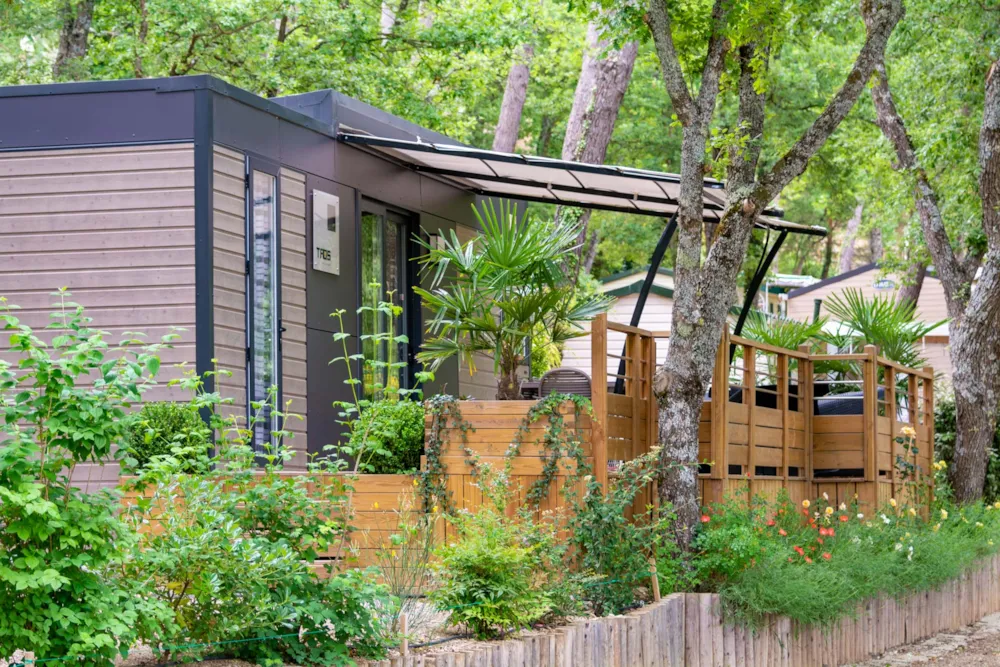 Mobil-home 2 personnes de 20 m² | 1 chambres | 1 lit double de 160 cm | 1 salle de bain | Terrasse de 15 m² | Climatisation | Télévision | Terrasse couverte | Draps | Plancha | Transats | Mobilier en aluminium | Wifi |