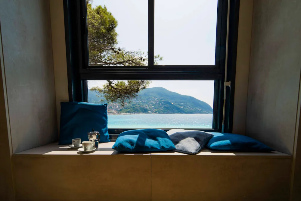 La chambre a une fenêtre au pied du lit double avec vue sur la mer.